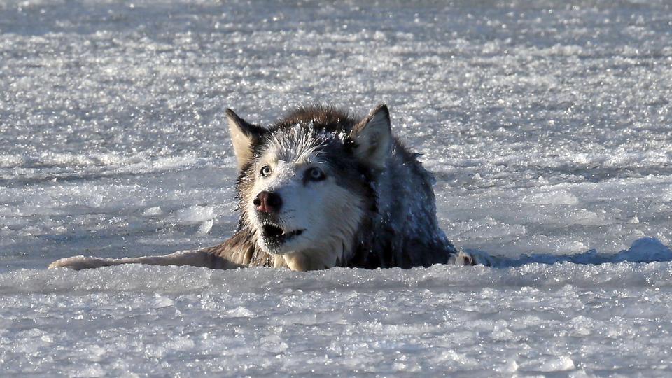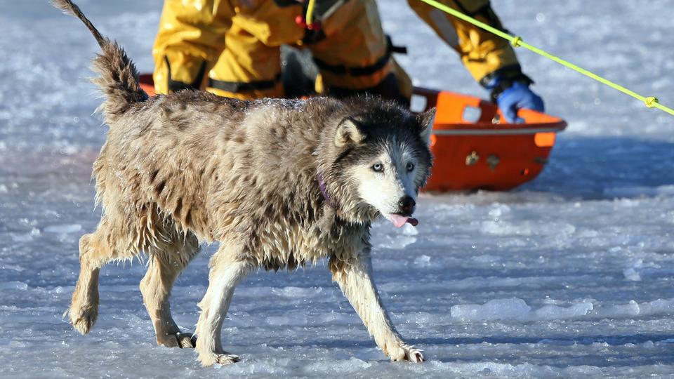 Sauvetage par un pompier d’un husky tombé dans les eaux glacées.